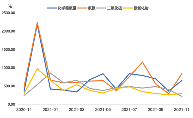 從四項排污權(quán)交易環(huán)比情況來看,呈現(xiàn)“三漲一跌”走勢。其中,氨氮、化學需氧量、氮氧化物環(huán)比分別上漲193.69%、81.78%和13.86%,二氧化硫環(huán)比下跌46.67%;與上年同期相比情況來看,化學需氧量、氨氮同比上行82.95%、73.38%|,二氧化硫、氮氧化物同比下行10.30%、0.25%。