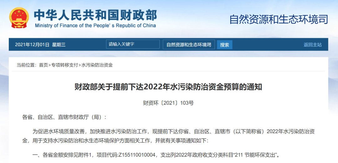11月17日,財政部發(fā)布《關(guān)于提前下達(dá)2022年水污染防治資金預(yù)算的通知》,對2022年的水污染防治資金做了安排。