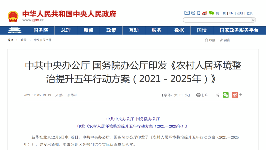 近日,中共中央辦公廳、國務院辦公廳印發(fā)了《農(nóng)村人居環(huán)境整治提升五年行動方案(2021-2025年)》,并發(fā)出通知,要求各地區(qū)各部門結(jié)合實際認真貫徹落實。