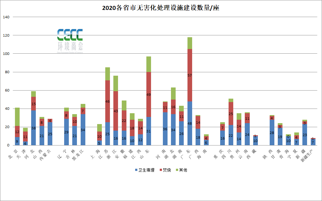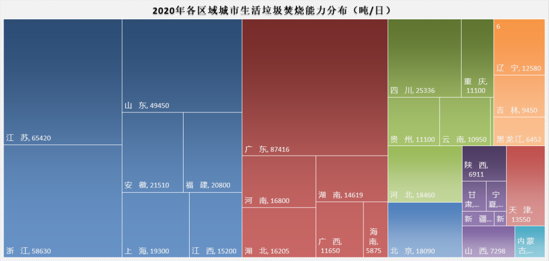 從無害化處理量上來看,截至2020年,在兩億多噸無害化處理總量中,垃圾焚燒處理生活垃圾14607.64萬噸,占處理總量的62%,衛(wèi)生填埋處理生活垃圾7771.54萬噸,占比約33%。其他無害處理方式處理生活垃圾1073萬噸,占比約4.6%。縱觀“十三五”這五年的數(shù)據(jù),衛(wèi)生填埋和垃圾焚燒這兩種生活垃圾處理的主要方式出現(xiàn)主次地位交替現(xiàn)象。分水嶺在2018年。2018年左右,填埋處理能力趨向頂峰,之后基本持平,略有降低,而城市垃圾焚燒處理能力“十三五”出現(xiàn)大幅提升,平均增速在21%。填埋和焚燒2018年經(jīng)歷持平之后垃圾焚燒能力超過填埋。如果從無害化處理量上來看,填埋處理總量在近兩年出現(xiàn)比較明顯的減少,2019年到2020年減少幅度在3175萬噸左右。截至2020年,廣東、山東、江蘇、浙江四個(gè)省無害處理設(shè)施建設(shè)數(shù)量領(lǐng)跑,分別為118座、97座、85座和76座,它們建設(shè)的垃圾焚燒處理設(shè)施也最多,分別擁有57座、49座、46座、43座。而衛(wèi)生填埋場相對(duì)較多的省市則是廣東?。?8座)、河北?。?8座),河南?。?6座),湖北?。?4座)。按區(qū)域來看,華北地區(qū)、華中地區(qū)以及西南地區(qū)、東北地區(qū)建設(shè)垃圾填埋場數(shù)量明顯多于華東、華南地區(qū)。如果從無害化處理能力來看,又是另一番景象。廣東、山東、江蘇、浙江四省無害化處理能力仍然領(lǐng)跑,其中垃圾焚燒處理能力分別達(dá)到87416噸/日、49450噸/日、65420噸/日、58630噸/日。可以看到排序略有變化,江蘇、浙江的垃圾焚燒處理能力高于山東省,推算如果論平均單體垃圾焚燒項(xiàng)目規(guī)模,江蘇和浙江省高于山東省。數(shù)據(jù)中還可以看到,這幾個(gè)省份是大力發(fā)展生活垃圾焚燒的省份,不僅焚燒廠建得多,而且垃圾焚燒日處理能力和處理量也處在突出高位。再看其他區(qū)域,實(shí)際上從日處理能力上來看,湖北、河北、四川等省市雖然垃圾焚燒廠不及垃圾填埋場多,但日處理能力比填埋高,仍是以垃圾焚燒處理為主,也可以看出這幾個(gè)地方單體垃圾焚燒處理廠的規(guī)模相對(duì)較大,而陜西、河南以及地廣人稀的東北地區(qū)等地仍以填埋為主要方式。