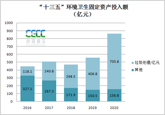 4. “十三五”城市環(huán)境衛(wèi)生固定資產(chǎn)投資情況“十三五”時(shí)期,城市市容環(huán)境衛(wèi)生累計(jì)固定資產(chǎn)投資總額2844億元,其中垃圾處理累計(jì)投資1770億元,較“十二五”整體增長145%。2020年,市容環(huán)境衛(wèi)生方面的固定資產(chǎn)投資額為862.648億元,占全年固定資產(chǎn)總投資的3.9%,其中垃圾處理設(shè)施建設(shè)投入資金逐年提升,從2016年118億左右增至2020年705.8億元,投資額占環(huán)境衛(wèi)生固定資產(chǎn)投資總額的比例較“十二五”提升42.2%。
