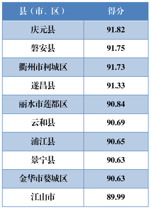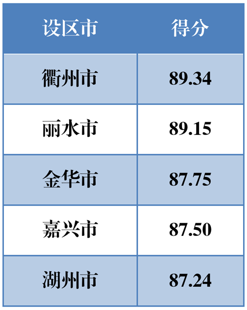 設(shè)區(qū)市比學(xué)趕超、保先爭先,呈現(xiàn)齊頭并進態(tài)勢,地區(qū)差異不斷縮小??偟梅峙琶叭坏姆謩e是衢州市、麗水市和金華市,區(qū)域之間最高與最低相差6.42,較去年收窄0.49。