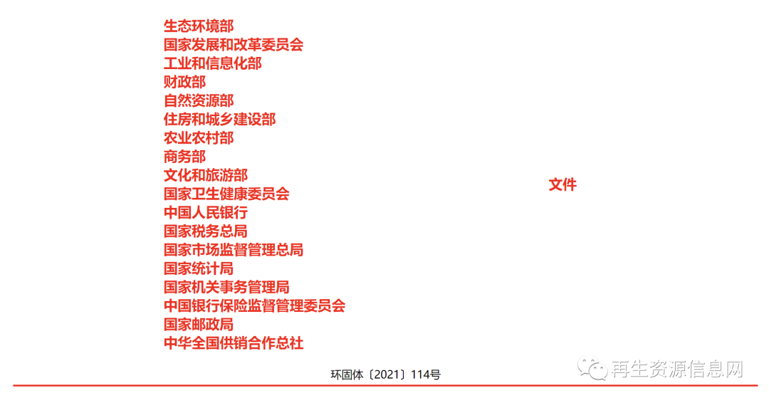 各省、自治區(qū)、直轄市及新疆生產(chǎn)建設兵團生態(tài)環(huán)境廳(局)、發(fā)展改革委、工業(yè)和信息化主管部門、財政廳(局)、自然資源主管部門、住房和城鄉(xiāng)建設廳(委、局、城管委、城管局、綠化市容局)、農(nóng)業(yè)農(nóng)村(農(nóng)牧、畜牧、獸醫(yī)、漁業(yè))廳(局、委)、商務主管部門、文化和旅游廳(局)、衛(wèi)生健康委、市場監(jiān)管局(廳、委)、統(tǒng)計局、機關(guān)事務管理部門、郵政局、供銷合作社;中國人民銀行上??偛?,各分行、營業(yè)管理部,各省會(首府)城市中心支行;國家稅務總局各省、自治區(qū)、直轄市、計劃單列市稅務局;各銀保監(jiān)局: