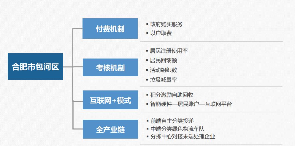 目前北京的16個區(qū)中我們已經(jīng)在8個區(qū)中開展了工作,除此之外,2017年1月,中標(biāo)合肥市包河區(qū)生活垃圾分類項目,該項目主要服務(wù)包河區(qū)10萬戶的居民垃圾分類服務(wù)工作。付費機制是政府購買服務(wù),按戶進行收費,每戶280塊錢。還有一套考核機制,根據(jù)居民注冊使用率、居民回饋額、活動組織數(shù)、垃圾減量率進行考核與反饋。